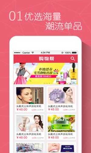 购物帮,全国最实惠的购物应用软件。这里每天都会有上千件的商品更新推荐,这里汇聚最时尚的潮流单品,精选9.9每天十点准时来抢购,还等什么,赶快叫上你的朋友来购物帮抢购吧!