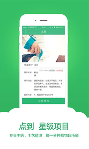 点到app特色: 1.时间任选,地点你定,给你想要的便捷。 2.中医执业技师上门服务,硕士医师供你选。 3.传统千元的服务,网络下单一折就行,首单只需数十元。