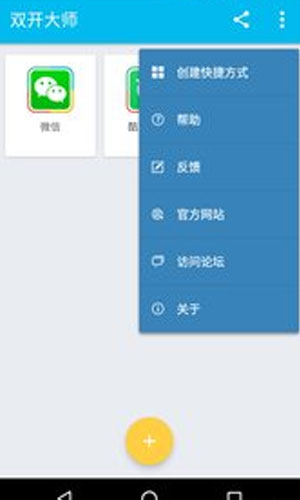 双开大师app是一款非常好用的手机软件。您只需在程序主界面点击添加需要登录另一账号的应用,双开大师即为您创建应用分身。双开大师app分身应用与原始的应用功能完全相同并且不同账号之间不会相互影响。