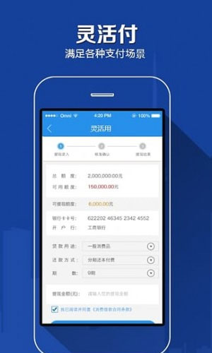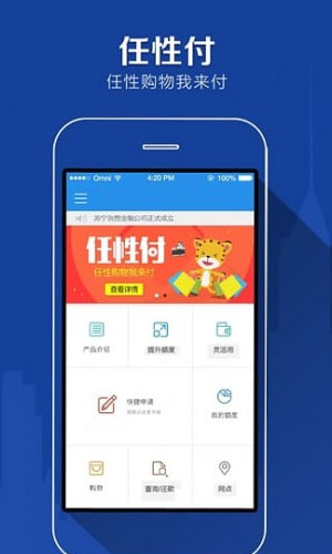 任性付客户端应用特色: 1.满足各种支付场景,非常灵活。 2.及时审核随时花,速度非常快。 3.最高能够贷20万,额度非常大。