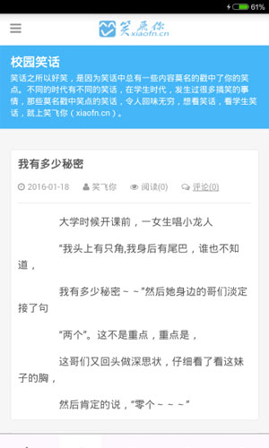 笑飞你app应用特色: 1.这里涵盖了交通笑话、生活笑话、冷笑话、经典笑话,以及各行业的笑话,并持续更新。 2.在这里,您可以与全球13亿国人分享你的笑话,同全球华人一起渡过快乐的时光。 3.我们的宗旨是:您的开心就是我们的快乐!