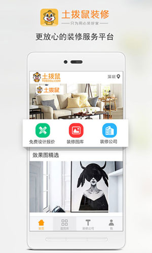 土拨鼠装修客户端应用特色: 1.业主可以知道想要的装修公司、免费预约,装修效果图大全采集装修灵感。 2.申请免费设计和报价,查询装修订单的进度。 3.装修公司可以接收订单信息、查看资金记录。