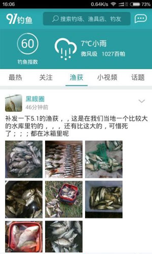 91钓鱼app应用特色: 1.第一时间发布全城垂钓资讯及赛事活动,不断挑战,钓鱼就要钓出新高度! 2.分享渔获喜悦、视频发布,参与钓鱼话题讨论,完美记录钓鱼生活的每个鲜活瞬间。 3.同步提供全城渔具店地理定位及产品服务,您还可以加入对应的钓友圈子,享受圈子信息共享服务。 4.为您提供涵盖全国的钓鱼-钓场信息,同城钓友关注约钓,内置地图一键导航,带您轻松直达钓场。