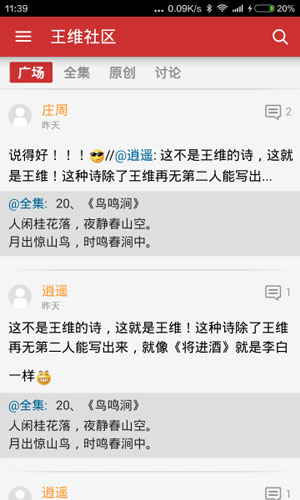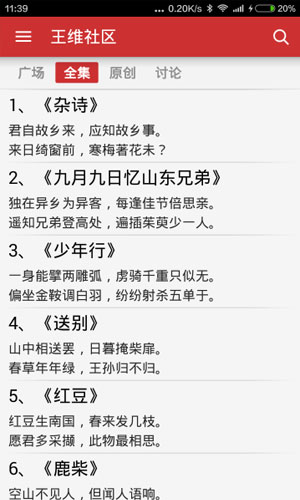 王维社区app应用特色: 1.这里不仅有王维的全部诗歌,还有喜欢王维的朋友自己创作的诗歌。 2.你可以一边阅读一边点评分享,也可以发表自己的作品。 3.绝不埋没任何人的精彩评论和创作,所有人都能第一时间看到。