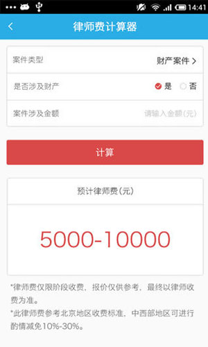 律师费计算器手机版应用特色: 1.包括民事、刑事、行政及涉及财产纠纷的律师费计算。 2.包含中国23个省、5个自治区、4个直辖市及2个特别行政区。 3.财产案件、非财产案件、离婚案件、人格权案件、知识产权案件。 4.劳动争议案件、行政案件、商标、专利、海事行政案件、管辖权异议不成立案件、申请支付令、申请公示催告、申请撤离等诉讼费。
