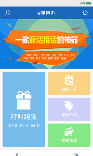 e搜服务app应用特色: 1.不管是什么大事、小事、麻烦事,都能为你事事代办! 2.来e搜服务app,不管是家里事还是单位事,都能上门服务! 3.包括上门家政服务、维修、开锁、同城速递、搬家、代驾、送餐、代购、接送、陪护、排队、交友、兼职!