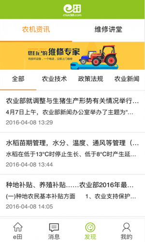 e田app怎么样: 1.提供农业最新资讯,农业知识在线学习等服务,方便实用。 2.为农机手与种植户撮合作业,让种植户和农机手之间实现信息互联互通。 3.曹操快修,为机主提供维修预约服务、附近加油站信息,让机手维修农机不被坑。