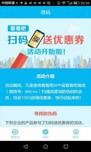 看看吧app,一款可以鉴别商品真伪和获取价格的手机软件,下载看看吧app,轻轻一扫,就能避免买到假货,获取价格信息,同时使用看看吧app还可获得优惠券哦,比价格、买便宜,就用看看吧app。