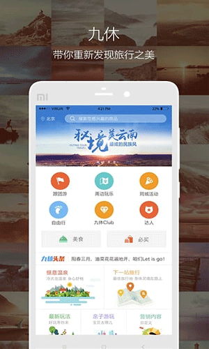 九休旅行app,一站式旅游服务平台,九休旅行app为用户提供目的地吃、住、行、游、购、娱、周边游、自由行等综合性服务,满足您多样的旅行需求,九休旅行app,玩转云南,一站搞定。