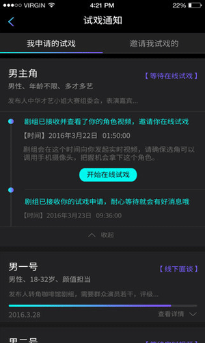 选角手机版特色: 1.海量角色筛选,新网剧、电视剧、电影等角色招募信息每天签约上线。 2.上传竞演秀,完成导演发布的试演任务,还能与剧组实时视频面试。 3.冯小刚、陆川等知名导演坐镇选角,给你机会与更多名导面对面。