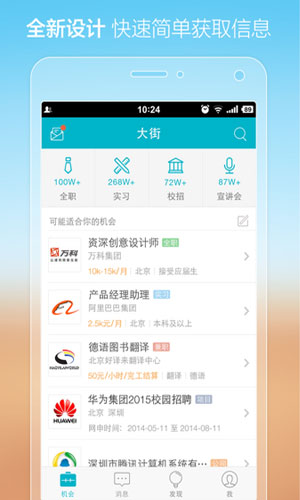 大街网安卓版是一款应用大街网手机客户端,软件提供丰富求职信息订阅及推送,支持手机端投递职位及获取面试通知,支持实时消息,面试邀请、HR留言、投递反馈,随时随地掌控求职进度。大街网安卓版同样是一款招聘神器,让好工作主动找你。当别人在苦苦搜索工作,你只需在大街网安卓版中一键设置,就可以坐等HR发来邀约;当别人在四处打探公司内幕,你只要一键查询,公司薪水八卦全部曝光;当别人为错过机会而懊恼,你只要一键制定,就能随时随地接收投递反馈。 大街网安卓版的特点: 1、大街网安卓版,实时接收最新的招聘职位、校招计划、面经攻略。 2、大街网安卓版,随心订阅职位,精准推送符合你心意的优质机会。 3、大街网安卓版,快捷投递简历、报名宣讲会,不错过任何好机会。 4、大街网安卓版,随时随地接收投递反馈和HR留言,及时掌握进度。 5、大街网安卓版,几百万家公司的员工点评、薪水爆料,无价之宝。