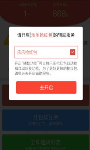 乐乐自动抢红包神器软件特色: 1.使用乐乐自动抢红包神器,抢钱就是这么任性,再也不用担心错过红包啦。 2.只要在手机里安装乐乐抢红包神器,就能轻松秒抢微信、QQ红包,安全免费不封号。 3.在乐乐自动抢红包神器中你可以尽情的喝酒聊天看电视,下载乐乐抢红包神器app,生活红包两不误。 4.乐乐自动抢红包神器是你随身必备的抢红包神器,红包抢到你手软,玩红包群互换,更多现金红包等你来拿哦。