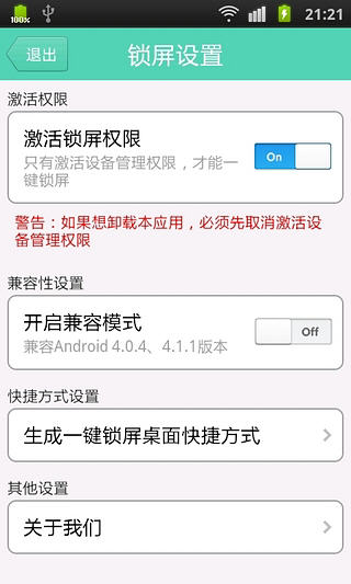 一键锁屏,简单快捷的一键锁屏方式,最大程度上帮你减少电源键的损坏,延长手机使用寿命。与其他同类软件相比,绝对是有过之而无不及。不相信的朋友,可以下来试试呀! 一键锁屏1.0.5版本更新内容 1.【新增】分享功能; 2.【修复】上一版本存在的问题。