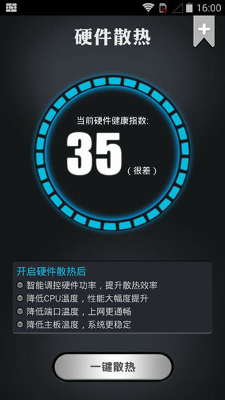 手机散热大师,一款专为手机打造的散热工具。不论是硬件,还是软件,只需开启一键散热,独立内核系统,便能帮你的手机智能散热,提升系统性能,降低CPU温度,保证上网时刻通畅。 手机散热大师4.8版本更新内容 1.【优化】系统内核机制; 2.【优化】程序响应速度; 3.【优化】用户交互体验; 4.【修复】上一版本的bug。