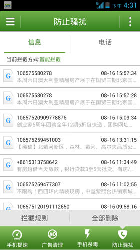 摩安卫士功能特色: 1、手机诊断功能自动扫描手机中的所有程序,从源头上杜绝恶意软件; 2、任务管理器可以一键结束所有运行的程序,减轻手机负荷; 3、自动过滤各类垃圾短信,过滤效果业内最高,高达98%的拦截率; 4、自动将骚扰电话添加到黑名单,增加过滤效果;IP拨号可自动添加IP号码,节省话费。