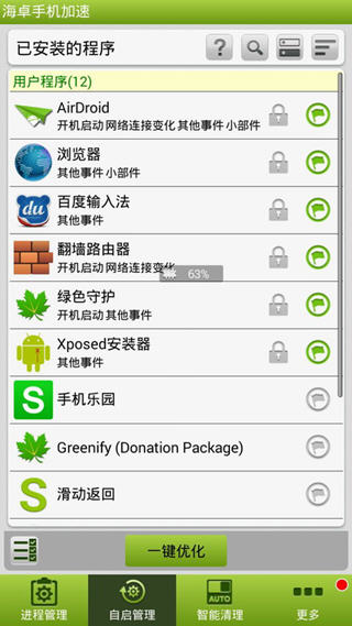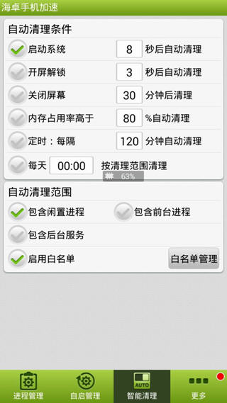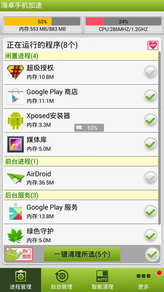 海卓手机加速,一款真正不反弹的手机加速软件。帮你全面提升手机运行速度,即便是某些个恶意后台自启动软件,也一样让它死于无形。更有智能化贴心功能,如开/关屏清理、定时清理、限值自动清理等,极致省电省流! 海卓手机加速去广告软件特色 -自动禁止某些应用后台自启动 -清理内存,完成手机加速 -支持开机清理及定时清理 -支持一键清理所有后台进程