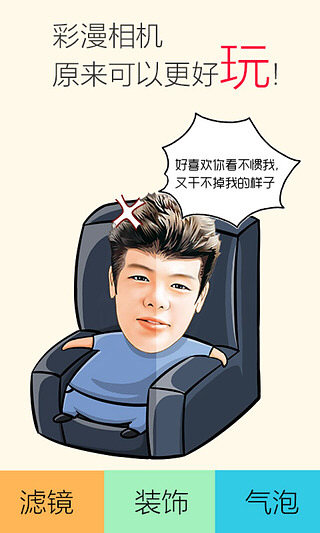 彩漫相机——告别黑白漫画手机也能拍出彩色漫画?亲,我读书少,可别骗我!没错,全球第一款彩色漫画相机重磅来袭,还在使用黑白漫画?Out了!!!彩漫相机——个人形象与彩色漫画的完美融合。莲花童子哪吒,独臂大侠杨过,内裤外穿超人,超级英雄蝙蝠侠,更有各种白富美、俏佳人、女汉纸、蛇精病造型等你来玩转,脸型、发型、配饰……百种选择,让你想怎么换就怎么换!个性化时代,自定义精彩! 彩漫相机1.6.39版本更新内容 1.新增美图资源; 2.修改sideeffect问题,图片显示效果更好; 3.修改若干Bug。