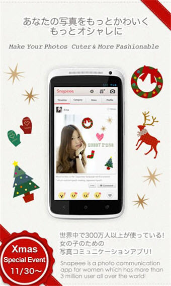Snapeee照片社交,一款专为女性打造的图片交友社区。通过Snapeee,你可以将你每天拍摄的照片,都用最具个性化的方式,完美展示在世人眼前,与小工具搭配使用,效果更明显哦! Snapeee照片社交软件特色 -专属Snapeee消息条,随时发布自己的心情留言 -利用文字、相框、图章等各种工具加工处理图片 -使用积分,下载添加更多新的小工具 -保存图片至本地或分享至社交网站