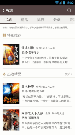 宜搜小说是一款阅读功能强大的电子书阅读软件,宜搜小说阅读器中拥有1000万本的海量正版图书阅读资源,言情、玄幻、都市、历史、网游、轻小说、科幻、校园、武侠、名著、军事、灵异、剧情、侦探、纪实等各类小说应有尽有,具有在线阅读、离线下载、全本缓存、秒速追更等功能特点,只需一键即可完成,同时宜搜小说阅读器中还提供了500万的站外小说索引,覆盖了网络上各类别的小说,为用户提供了海量的网络小说搜索服务,独特的“云书架”功能,跨终端数据同步,实现无缝阅读,独有的社交书友圈,让你跨平台分享、吐槽、互动,让你阅读不再孤单。宜搜小说2.12.0新增朗读功能和夜间模式,让用户解放双手,有效的保护了眼睛。