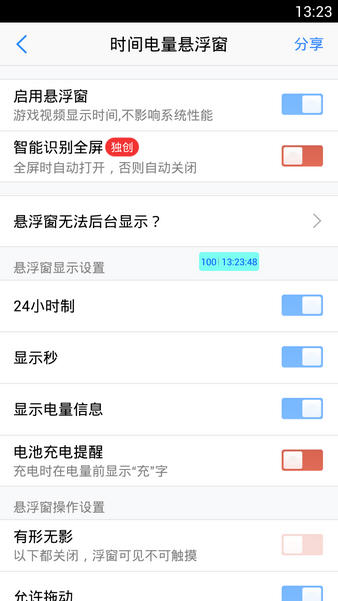 悬浮窗大师应用特色 1、时间、电量、流量等悬浮窗全监控; 2、轻松的手机应用,便捷的悬浮窗查看; 3、小巧的安装包,节省流量,不耗资源。