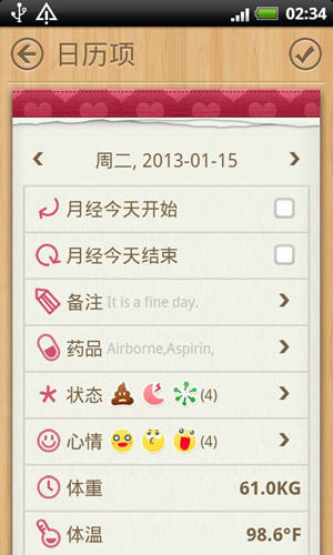 女性日历功能: 1、记录各种情绪,心情,还有生理周期; 2、提示建议各种情况下应该怎么去处理; 3、就医的时候甚至可以把数据发给医生,这样坐诊更准确; 4、女性日常生活必备的贴心小秘书