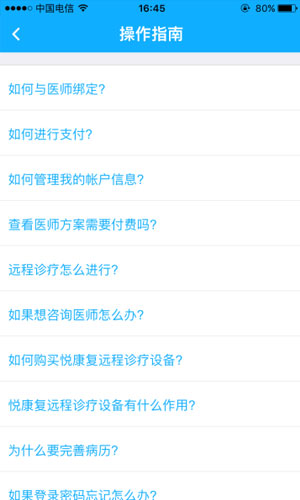 悦康复app是一款非常便利的健康护理类的手机软件。悦康复app针对我国脑卒中康复人群面临的康复资源不足,诊疗成本高昂的问题,悦康复app结合相配套的远程诊疗设备,而开发的基于智能手机及移动终端的手机端应用软件。