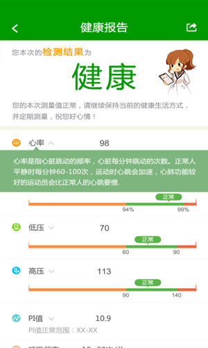 全民健康app应用特色: 1.随时随地监护您的健康。 2.帮您建立完整、持久的健康档案。 3.针对心率、血氧、血压等生理指标进行综合健康评级,给您提供健康建议和运动建议。