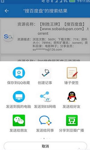 在“搜百度盘”APP中,你可以选择性地在线分享任何资源给你的好友;长按某结果项即可随心分享资源互补。