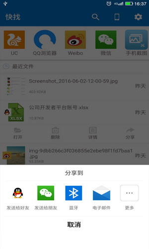 快找文件管理软件特色: 1.快找文件管理支持QQ、微信、微博、uc浏览器等常见App。 2.用户可以使用快找文件管理快速查看APP内最近的文件,非常的实用专业。 3.快找文件管理支持文件的快速分享;也.支持APP内的文件搜索,轻松为用户打造最好用的文件管理软件。