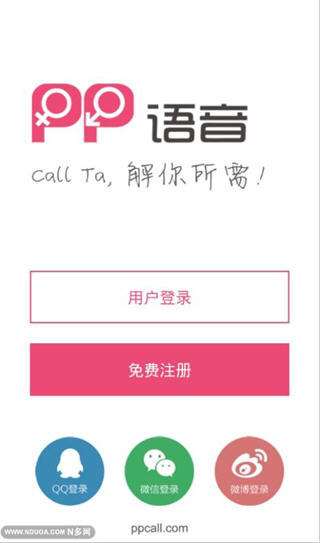 PP语音,随时与心动女神畅聊到天明(当然得对方愿意啦)。一款真正的语音交友软件,不论对方在线与否,你都可拨通对方手机(注意,是拨通哦!)。同时,你还可以隐藏手机号与帅哥美女畅聊一下。 PP语音软件特色 1.随时拨通女神电话,聊得投机,还可线下继续聊; 2.随时发送语音,照片,获取与女神男神见面聊的机会; 3.屌丝再也不用担心对方甩都不甩你了,咱可以接茬电话聊。 PP语音2.4版本更新内容 1.【新增】放电功能规则说明; 2.【新增】黑名单功能; 3.【优化】用户界面; 4.【修复】一些小bug。