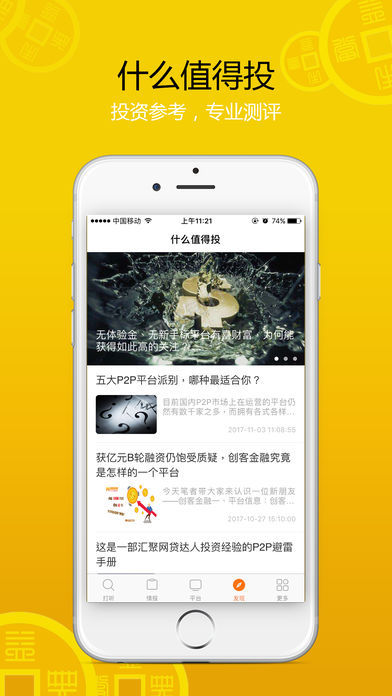 4.什么值得投:包打听专业点评团队对评测平台深入观察,挖掘出平台的每一个优点与弊端,最终整合为一篇详尽、客观的专业评测呈现给用户,让您的理财道路一帆风顺。