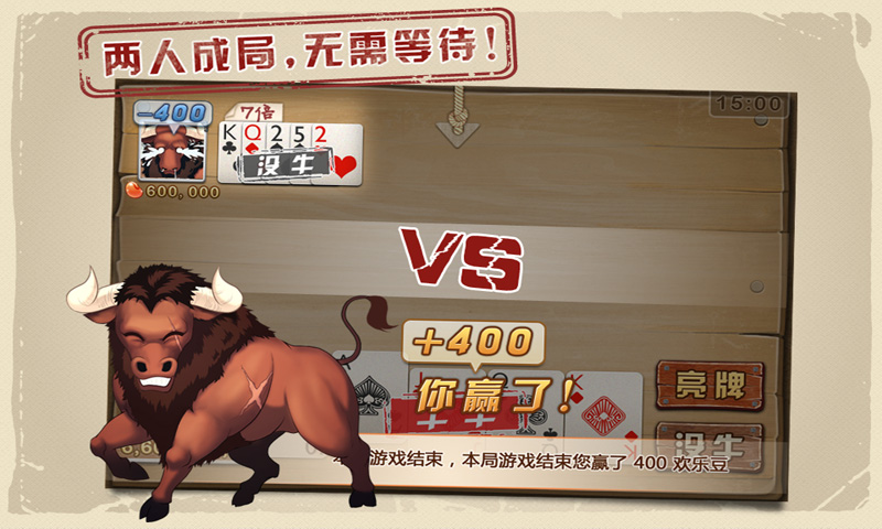 QQ斗牛是为喜欢斗牛游戏的玩家精心打造的掌上游戏,因为在线玩家多,玩法简单,斗智斗勇,博得很多玩家的喜欢。精美的UI设计、丰富的动画效果、欢快的游戏音效、独特的荣誉设置,必定为手机玩家们奉上一场游戏盛宴。
