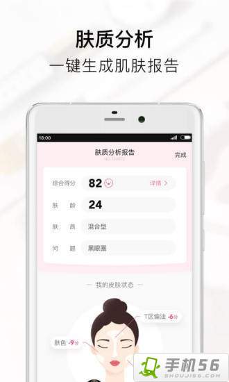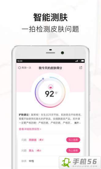 AI科技,一键测肤:自拍测肤,联合上海皮肤医院为你提供专业的肌肤报告;黑头、痘痘、黑眼圈、干涩肌肤问题一网打尽。