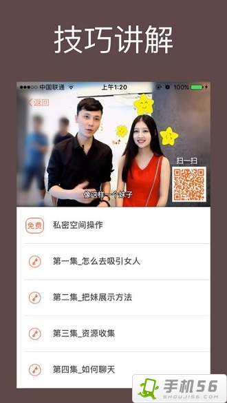 还在为不会把妹而烦恼?今天手机56小编给小伙伴们带来一款把妹课堂APP下载,恋爱把妹课堂安卓最新版下载,一款手把手教你如何撩妹子的恋爱app,赶紧来试试吧!