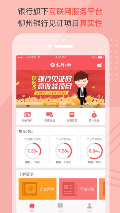 龙商e融是一个很好用的金融服务软件,这里有着丰富的投资理财产品来供你选择。用户随时随地都能在线投资,喜欢的朋友赶紧下载体验吧。