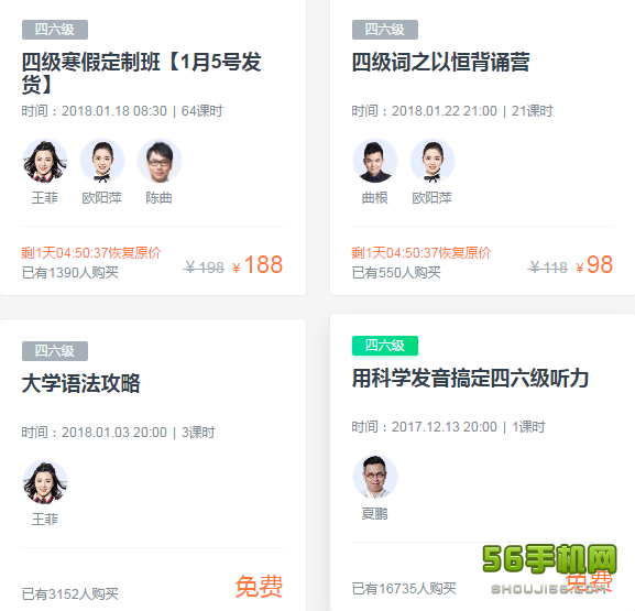 【四六级-真题,单词,听力,阅读写作】 -背单词:掌握背单词方法,搞定四六级核心词汇! -练真题:新版四六级历年真题解析! -听名师:赵建昆,新东方20年功勋教师;曲根:原新东方高级主管;王菲:原新东方写作一姐