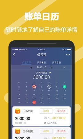 2、借还日历,用户可以在日历上一目了然的看到自己记录的债务账单信息,同时可以在日历上添加账单的还款信息。