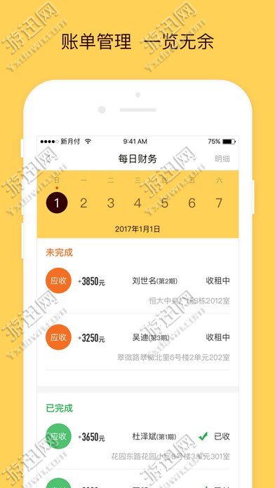 1.日程管理:清晰呈现每日应收账单,可通过日历快速浏览。