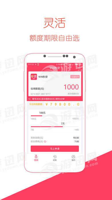 999秒贷,专业的手机贷款应用。凭借身份证就可以在线申请贷款,系统审核通过后立马下款。不耽误您的宝贵时间,还款灵活方便。