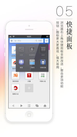 UC浏览器是一款在iOS设备上的网页浏览器应用,UC浏览器支持隐私保护、语音搜索、多点触控、左右滑屏、手势操作、微博分享、乐园同城,让你简单享受浏览,完美体验多彩移动生活,新版本还支持二维码扫描和银联支付。