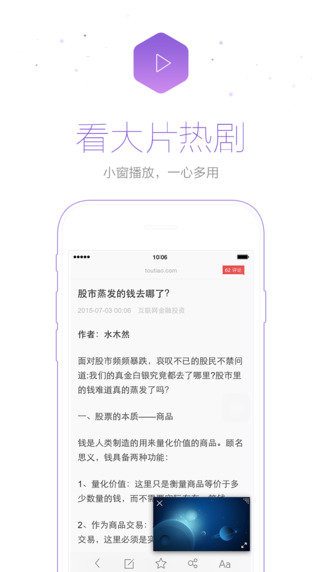 ?最流行的手机浏览器,超过5亿人在使用 ?速度极快,眨眼功夫,瞬间抵达 ?UC头条新闻,天下热点即时掌握 ?免费追小说、看视频,消磨时间不花一分钱