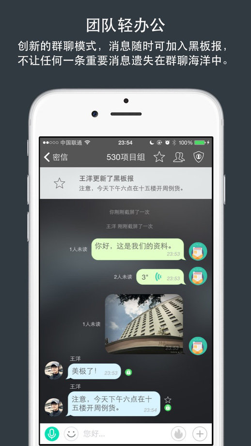 创新的群组聊天模式,每条消息被群内哪些成员阅读、未读一目了然,更可随时将重要信息加入黑板报,以免淹没在群聊海洋中。黑板报具有群组信息收藏的记事本功能,群成员可以方便的翻看企业团队重要信息记录。