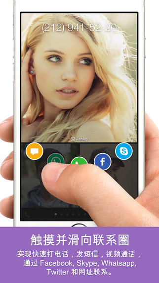 触摸并滑向联系圈,实现快速打电话,发短信,视频通话,通过Facebook,Skype,Whatsapp,Twitter和网址联系。