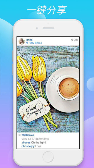 3.[一键分享] 一键分享到微信,微博,QQ等各大社交平台! 向朋友们秀出最酷的艺术照片,最酷的你!