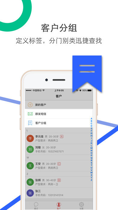 【客户】 通过“新的客户”可以快速一键导入导出通讯录的客户,方便快捷;通过“群发短信”可以免费快捷的给意向客户发送信息,还支持模板定制;通过“客户分组”可以对客户以意向楼盘和属性标签进行标签定义,方便快速准确的查找沟通管理客户;通过“搜索”功能可以分“客户信息”“跟客内容”“录客时间”“跟客时间”“预算总价”对客户进行精准而强大的搜索。