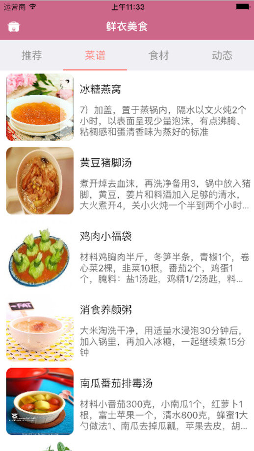 10万篇的菜谱软件如果你拥有,你还会有找不到的菜谱吗?每篇菜谱都有详细的制作过程图片及文字说明,你还会担心有学不会的菜谱吗?快来加入吧.享受美食生活,就在鲜衣美食!
