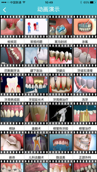 2:医患沟通 2.13D演示以3D的方式展示患者口内病情,通过点击病牙,选取相应的病症,让患者直观的了解病情,并可支持VR技术(VR操作因硬件设备关系,暂未开放) 2.22D演示按照牙体牙髓/牙周病的病症发展进程,以图片的方式列出病症树和治疗决策树,以及病症/治疗的对应关系,让患者迅速了解病情演化以及相应的治疗过程。 2.3动画演示整理了常见口腔疾病的优秀治疗视频。 2.4治疗案例将自己的优秀案例以最直接的方式展现给患者。案例制作可以通过PC端组件制作上传,也可以直接调取手机内的图片。 2.5平台定期发布的医患沟通文章一键分享到患者微信。