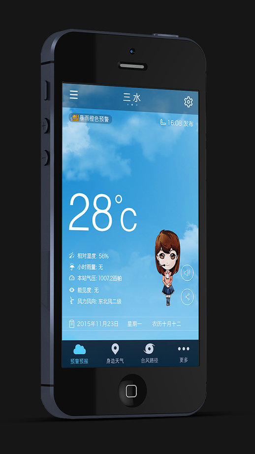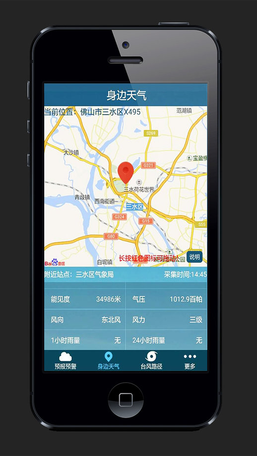 三水天气是由佛山市三水区气象局提供的气象资讯平台,在进入系统的页面中会快速清晰准确的显示当前三水区的天气现象,包括实况温度、湿度、能见度、小时降水、风力风向,还包括当前预警、三小时预报、未来五天预报。在身边天气栏目中,根据定位显示当前最近的自动站天气实况。在更多栏目中可以查看更多更专业的天气信息。