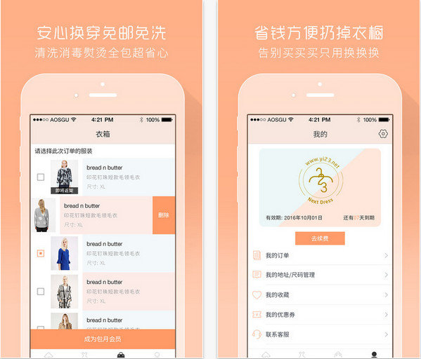 无忧换穿最快循环免运费,往返快递均包邮,配送新的衣箱取回上次穿完的衣服;免除押金,购买包月会员服务无需任何押金