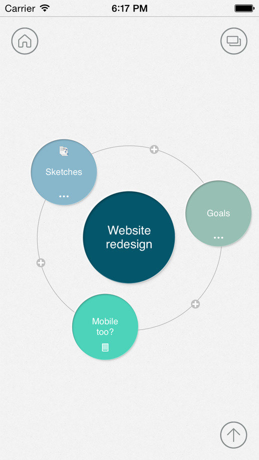 Mindly是一款关于灵感,笔记类的软件。Mindly有两个特点:一个是导图展示排布的形式,另一个是支持添加条目的类型。主流的思维导图应用一般是框图、树状图的形式,Mindly则采用了如同星系分布一样的圆形,虽然UI设计不算很讨喜,但是动态效果让人感到一定的新鲜感。
